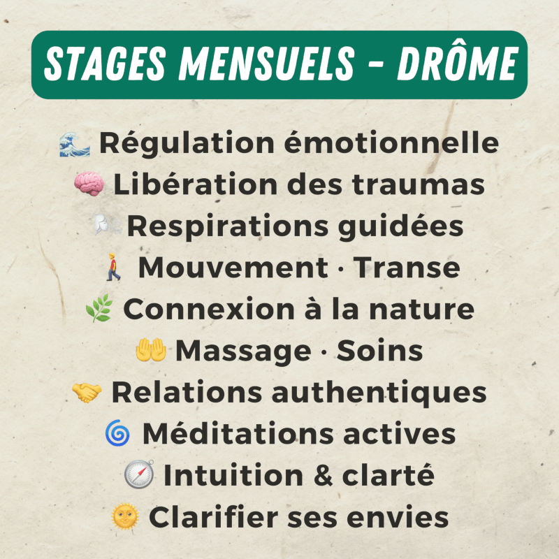 Ces explorations s’appuient sur des approches issues du travail psycho-corporel, de la régulation du système nerveux, du breathwork et de la libération des traumas — toujours adaptées à l’instant et aux personnes présentes.